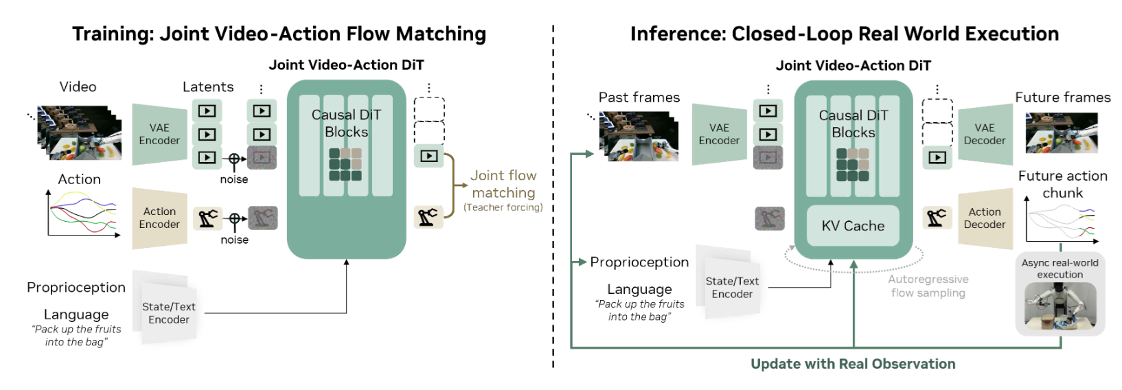 As shown in Figure 1, DreamZero feeds three inputs into a shared autoregressive Diffusion Transformer, or DiT, backbone: visual context encoded via a Variational Autoencoder, or VAE; language instructions via a text encoder; and proprioceptive state via a state encoder. The backbone jointly denoises both future video frames and actions through separate output heads. During inference, the model generates future video and action chunks autoregressively, feeding ground-truth observations back into the Key-Value, or KV, cache after each execution cycle to prevent predicted video errors from compounding over time. π₀.₅ separates high-level subtask prediction from low-level action generation through a two-stage hierarchical inference procedure; DreamZero collapses both levels into a single forward pass conditioned on predicted visual futures.