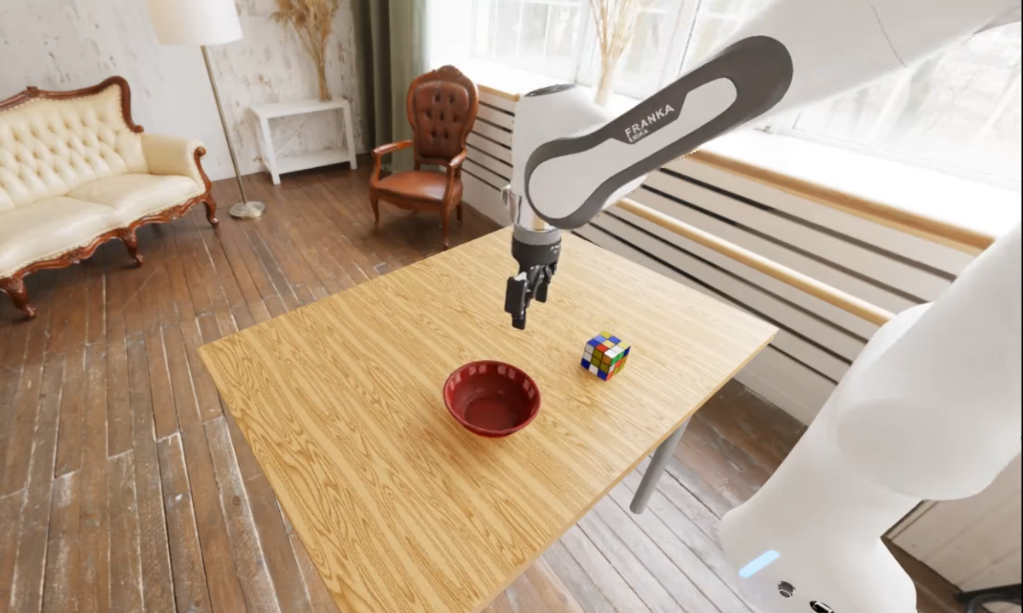 I evaluate both policies in Isaac Sim/Lab, NVIDIA’s robotics simulation framework, using Scene 1 of the sim-eval environment. The scene places a DROID robot arm at a fixed table with a Rubik’s Cube and a red plastic bowl. Figure 2 shows the setup.