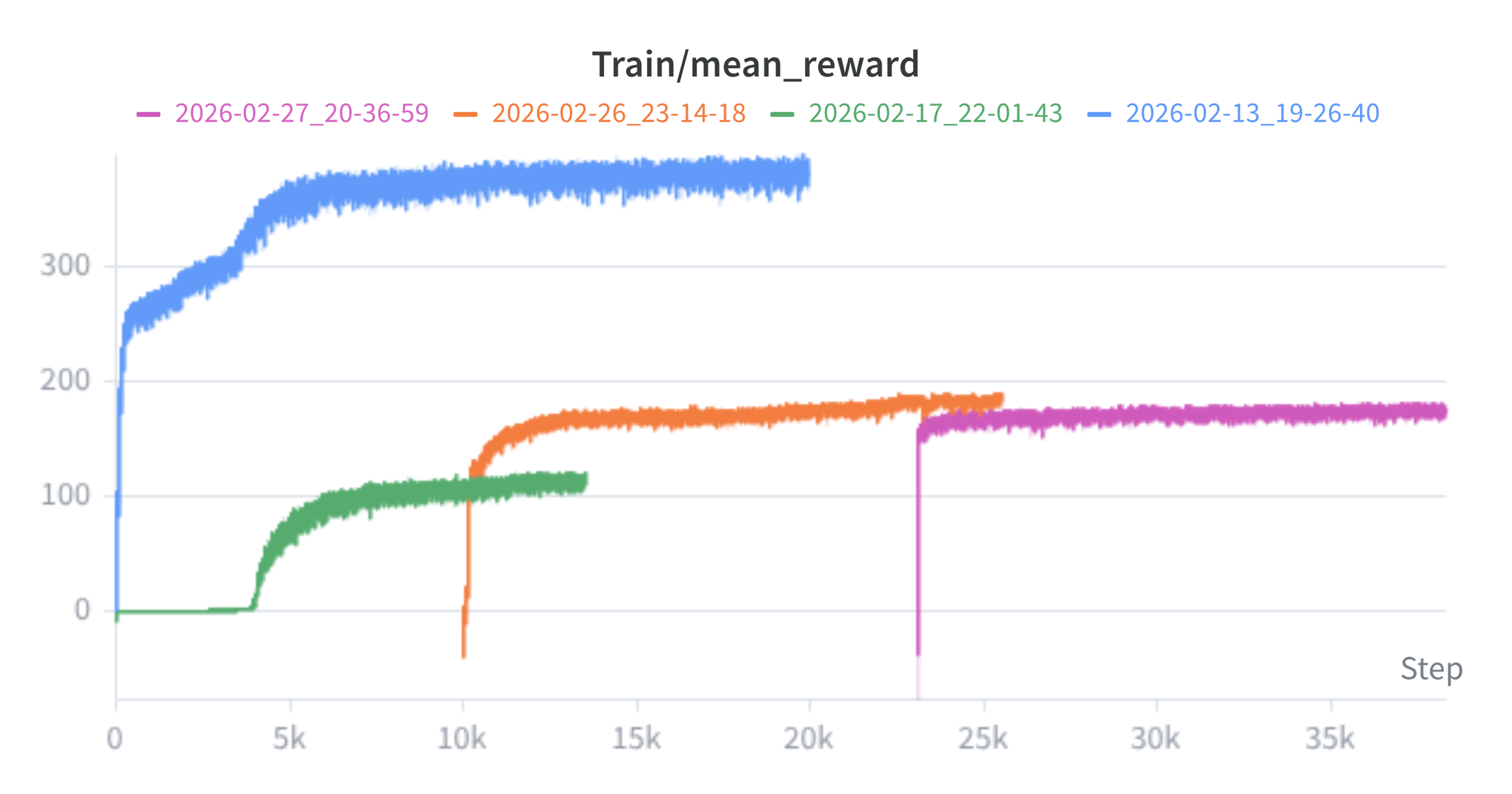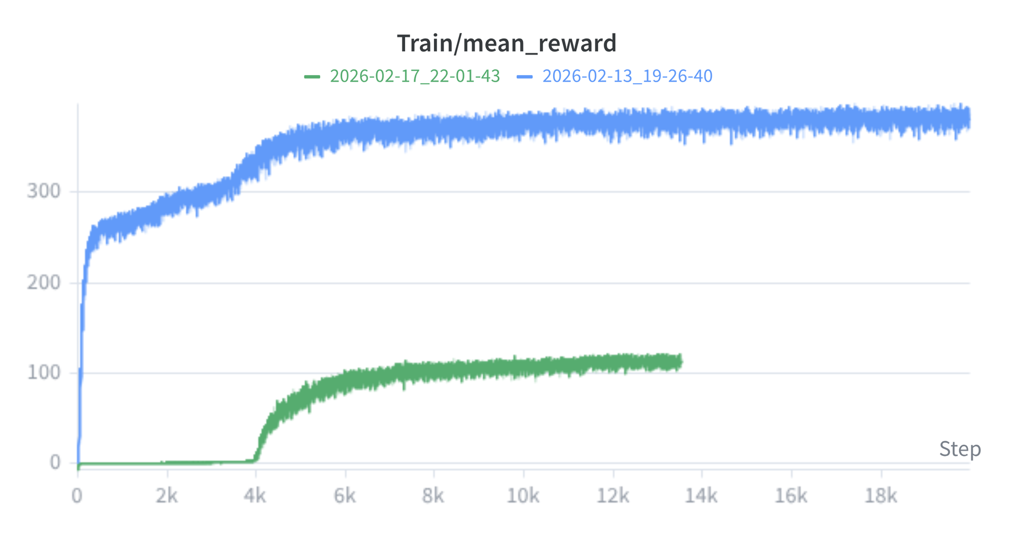 entropy_coeffrom 0.0025 → 0.005: the entropy bonus discourages premature convergence of the policy distribution.init_noise_stdfrom 1.0 → 2.0: the initial standard deviation of the Gaussian action distribution. Higher values produce more diverse early actions, increasing the probability of discovering useful behaviors.
