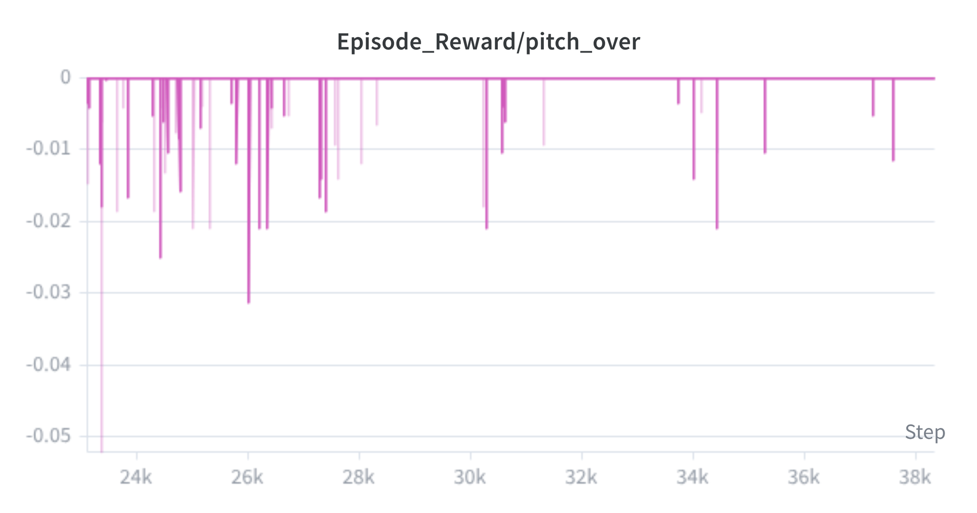 The front_feet_contact penalty started near −1.5 per step at the beginning of hind legs training and converged to approximately −0.16, indicating the policy keeps the front feet off the ground most of the time with only occasional brief contacts. The action_smoothness penalty improved from −0.9 to −0.45, reflecting convergence toward smoother joint commands. The pitch-over graph (Figure 14) is particularly informative: the monotonic decrease in fall-over penalty signal indicates the policy is learning to recover from near-falls rather than simply avoiding the posture.